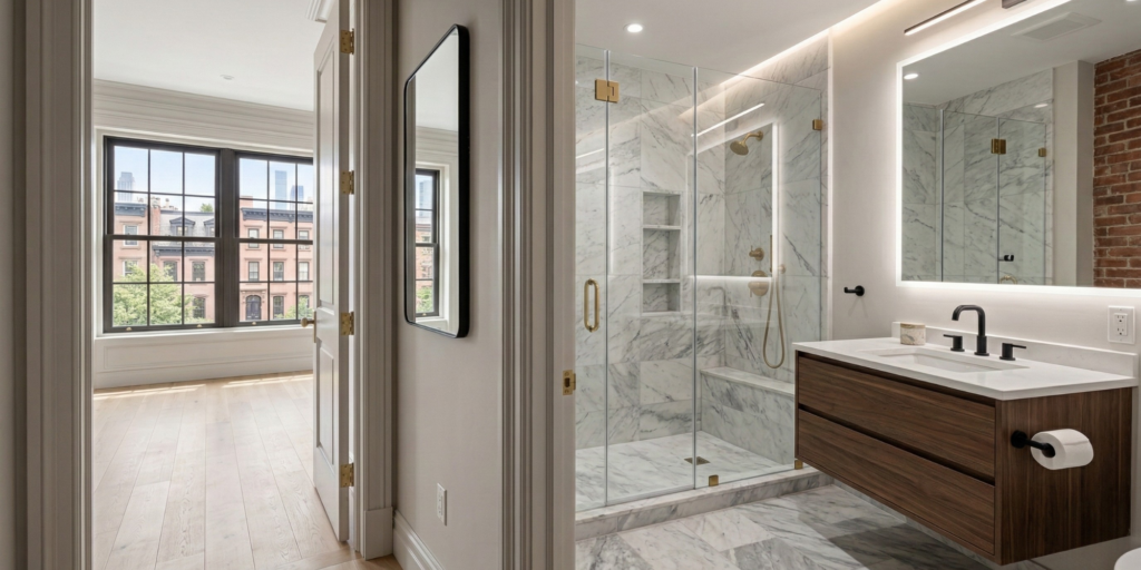 Engineered wood and luxury vinyl plank are popular choices for NYC apartments because they’re compatible with concrete subfloors, offer sound-dampening options for co-op/condo requirements, and handle humidity fluctuations well. Solid hardwood works best on wood subfloors in houses and brownstones.